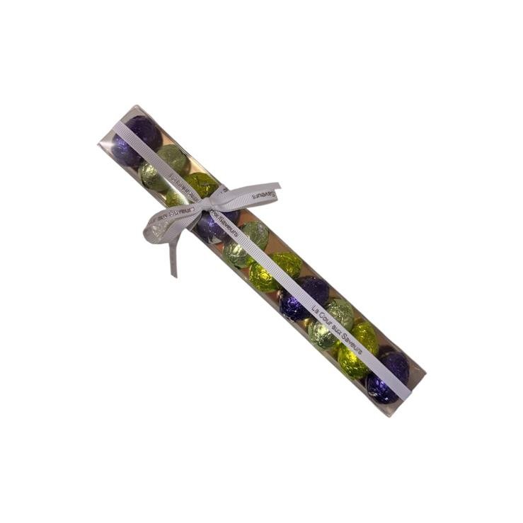 Sous leur fine coque se cachent trois cœurs fondants : une ganache intense et veloutée, un praliné généreux aux notes de fruits secs, et un gianduja délicatement fondant à la noisette. Trois textures, trois plaisirs, pour une dégustation riche et profondément chocolatée.