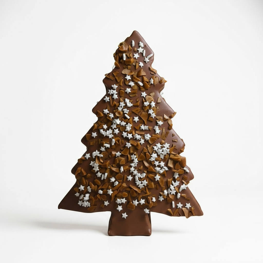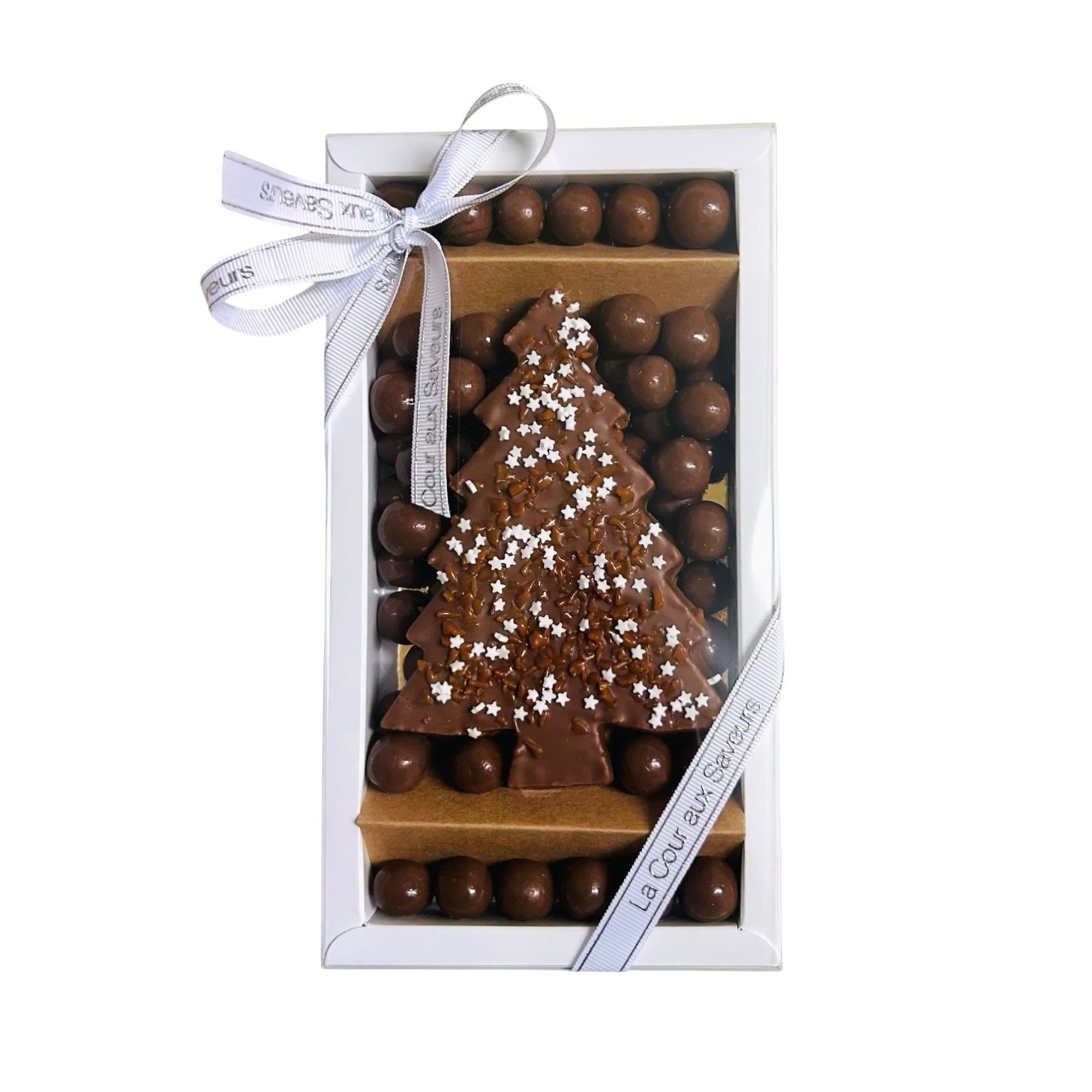 Ingrédients : Sapin (chocolat lait (sucre, beurre de cacao, poudre de lait entier, pâte de cacao, émulsifiant : lécithine, arôme naturel de vanille), brisures de crêpes (farine de blé, sucre, beurre concentré (lait), poudre de lait écrémé, malt d’orge, sel), sucre, amandes, huile végétale : tournesol, émulsifiant : lécithine) chocolat lait au caramel (sucre, beurre de cacao, poudre de lait entier, pâte de cacao, poudre de lait écrémé, sucre caramélisé, sirop de glucose caramélisé, émulsifiant : lécithine, arôme naturel, arômes naturels), éclats de caramel au beurre salé (sucre, sirop de glucose, lait entier en poudre reconstitué, crème d’Isigny AOP (lait), beurre salé d’Isigny AOP (3,6 %) (lait), sel de Guérande IGP (1,2 %), émulsifiant : lécithine de colza), décor confiserie étoiles blanches (sucre, beurre de cacao, amidon de pomme de terre, farine de riz, amidon de maïs)), Céréales maltées croustillantes enrobées de chocolat lait (sucre, beurre de cacao, céréales maltées croustillantes 18,2 % (farine de blé, amidon de blé, farine de blé malté, sucre, extrait de malt d’orge, lait écrémé en poudre, sel), caramel (lait écrémé, lactosérum (lait), sucre, beurre (lait), arôme naturel), lait entier en poudre, fève de cacao, maltodextrine, émulsifiant : lécithine de tournesol, agent d’enrobage : gomme shellac).